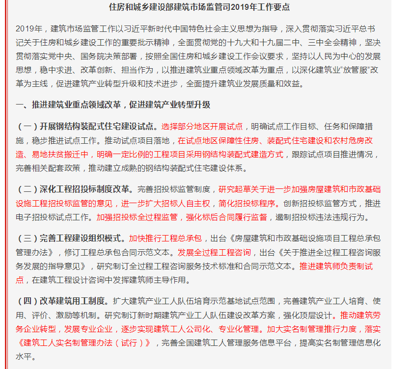 剛剛,《住房和城鄉(xiāng)建設(shè)部建筑市場監(jiān)管司2019年工作要點(diǎn)》正式印發(fā)。2019年建筑業(yè)重點(diǎn)領(lǐng)域改革力度,可謂前所未有!